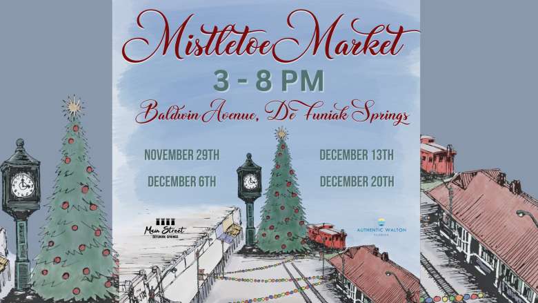 Main Street DeFuniak Springs will host its annual holiday events, Merry Main Street, presented in partnership with Authentic Walton. Beginning Saturday, November 29, 2025 – Saturday, December 20, 2025, the free events will include live music and performances, the weekly outdoor Mistletoe Market, Festive Food Truck Friday, a holiday golf cart parade, visits with Santa and Mrs. Claus, snow machines, and more family fun – all taking place in historic downtown DeFuniak Springs.
