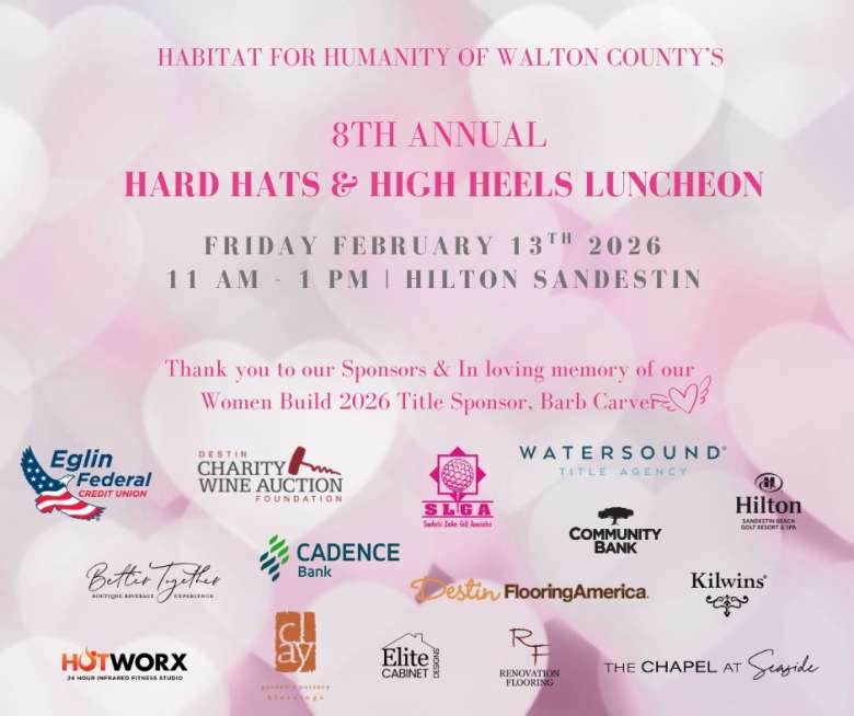 Habitat Walton County invites you to join them at the annual Hard Hats & High Heels, a women's empowerment luncheon bringing together a cross-section of the Emerald Coast's professional, social, and philanthropic leaders. The Hard Hats & High Heels Luncheon takes place on Friday, February 13th at The Hilton Sandestin Beach Golf Resort & Spa from 11AM - 1PM.