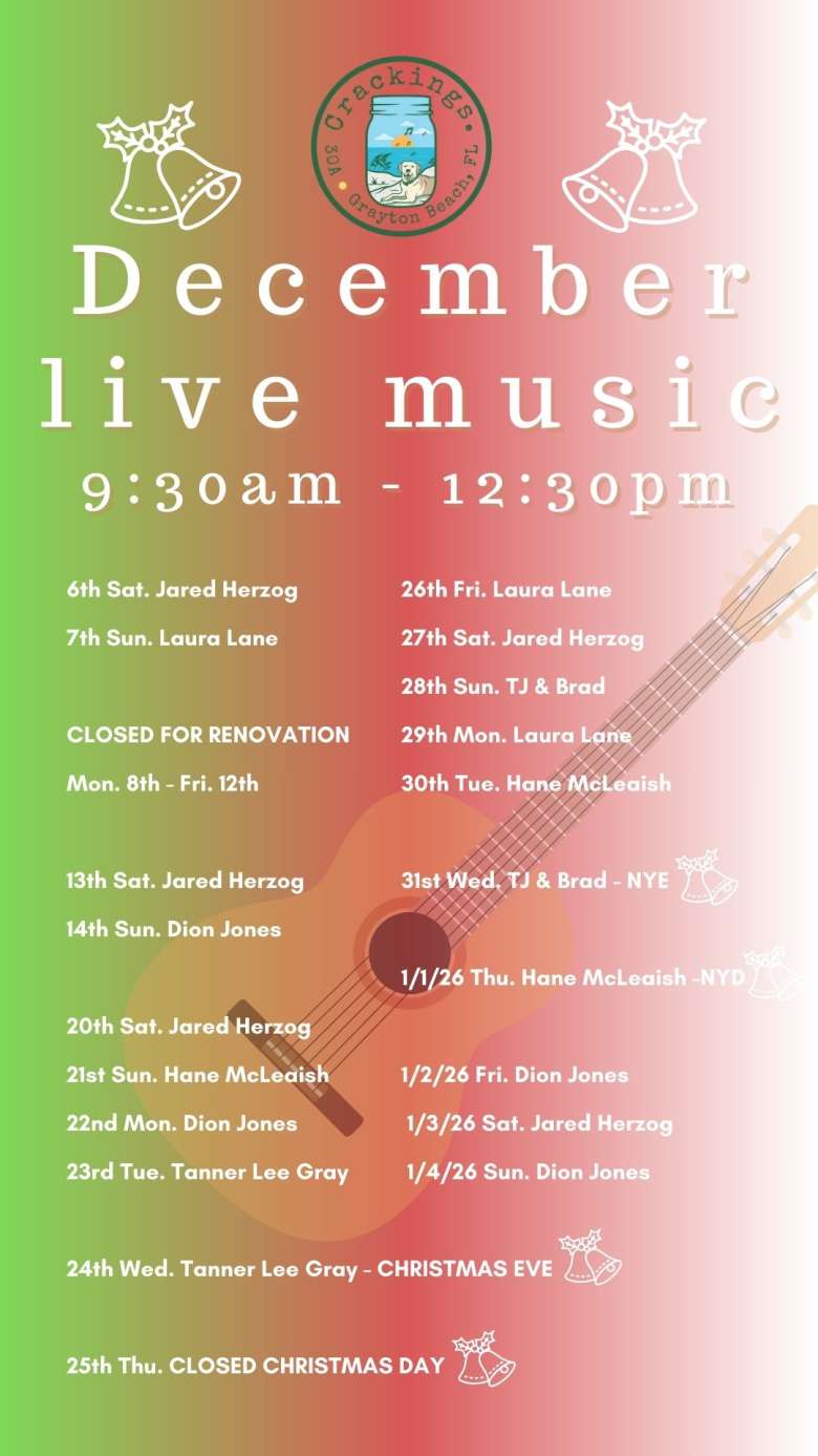 LIVE music at Crackings. from 9:30AM - 12:30PM. Located in Uptown Grayton in Grayton Beach, FL, enjoy good vibes, a pet friendly patio, a delicious meal, and their famous mason jar Mimosas & Bloody Marys. Bring the whole family out to support SoWal's fantastic local musicians! See the music lineup below.