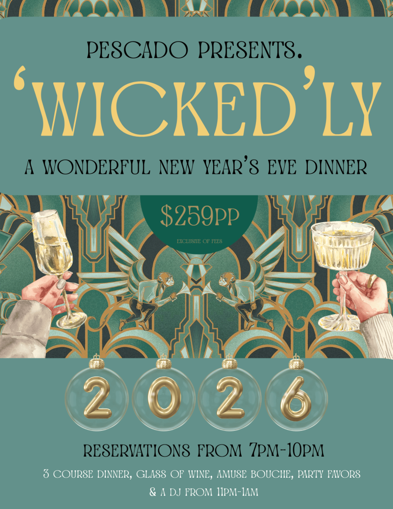 Step into the new year like you’re stepping into Oz—full of sparkle, mystery, and a little rebellion. Pescado’s NYE celebration 'Wicked'ly invites you to rise above the ordinary and enter a night that feels downright defyingly wicked. Reservations: 7PM - 10PM
