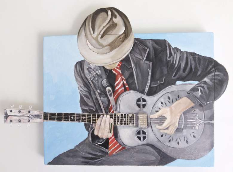 Andy took art while at SoWal High and hasn’t stopped creating since. He is well known for his mixed-media assemblage art. His style includes characteristics of cubism, folk art, and outsider art. He primarily works with house paint, found objects, recycled musical instruments, reclaimed wood, and repurposed materials.